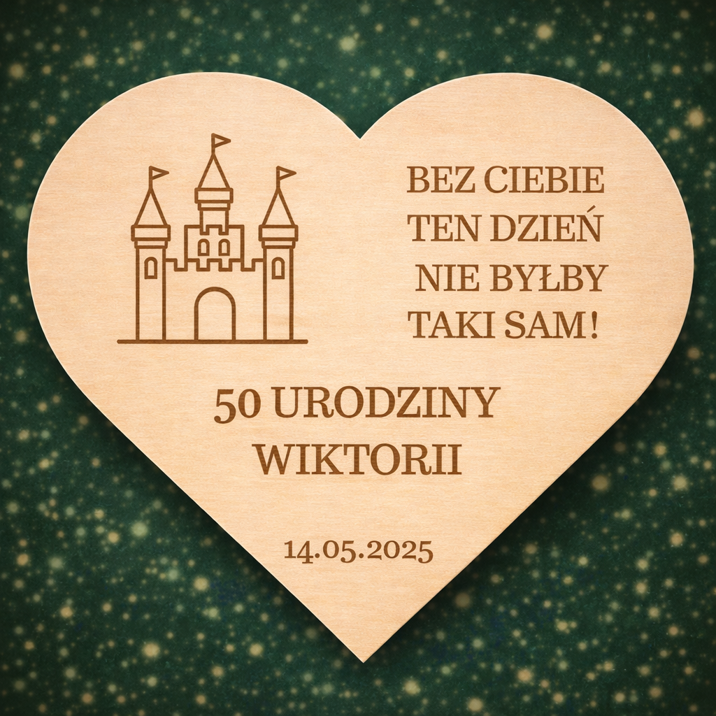 Każda pamiątka tworzona jest na indywidualne zamówienie. Personalizacja obejmuje imię jubilata, datę wydarzenia oraz liczbę 50. Elegancka stylistyka i jubileuszowy charakter projektu sprawiają, że pamiątka idealnie wpisuje się w klimat uroczystych przyjęć oraz eleganckich spotkań rodzinnych.