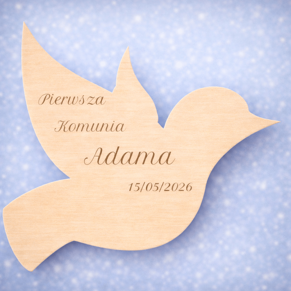 Motyw gołąbka – symbol Ducha Świętego – idealnie wpisuje się w klimat komunijny. Każda pamiątka wykonywana jest z naturalnej sklejki o grubości 3 mm i precyzyjnie grawerowana laserowo, co zapewnia trwałość oraz estetyczny, subtelny efekt premium.