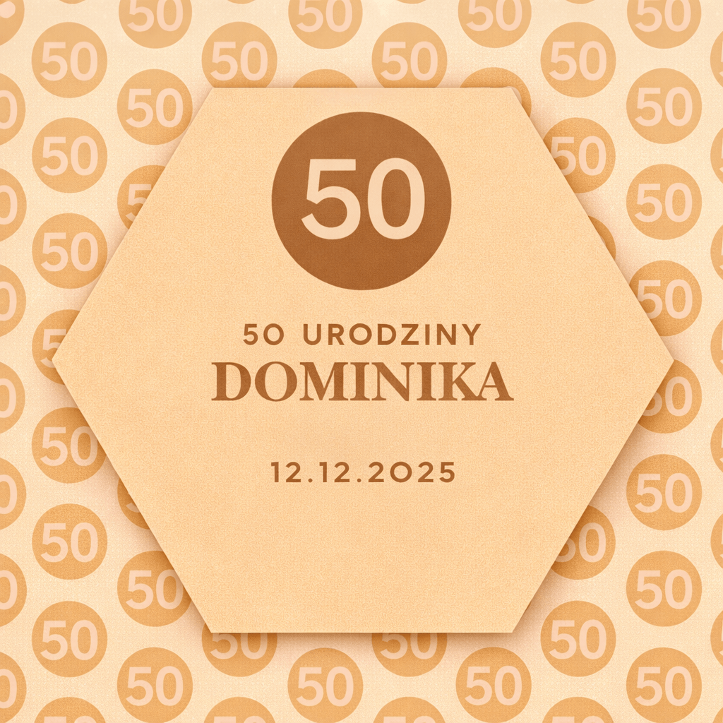Każda pamiątka tworzona jest na indywidualne zamówienie. Personalizacja obejmuje imię jubilata, datę wydarzenia oraz liczbę 50. Czytelna, jubileuszowa stylistyka projektu sprawia, że pamiątka doskonale wpisuje się w klimat uroczystych przyjęć urodzinowych – zarówno eleganckich, jak i bardziej swobodnych.
