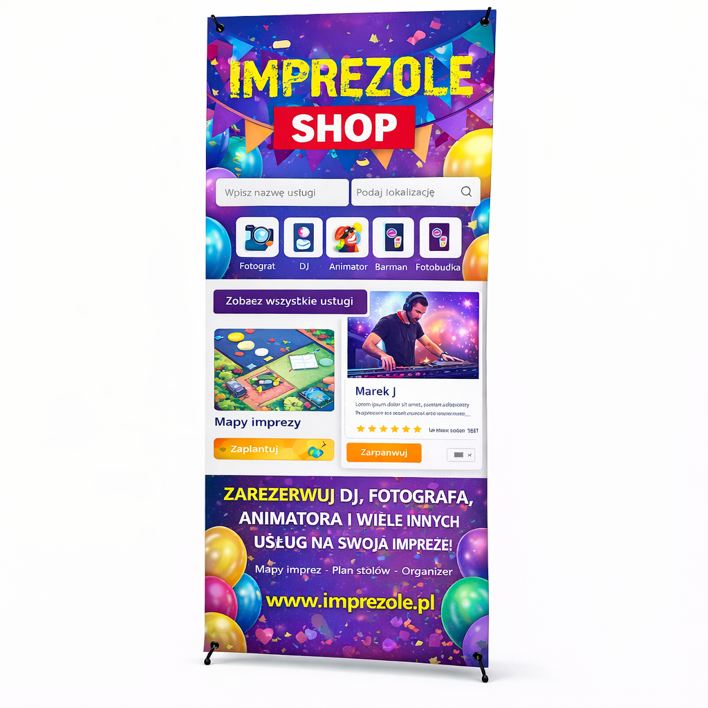 Duża powierzchnia reklamowa o wymiarach 80 × 180 cm pozwala skutecznie zaprezentować grafikę reklamową, logo firmy lub komunikat marketingowy. Baner doskonale sprawdzi się jako nośnik reklamy w galeriach handlowych, na targach, eventach branżowych, konferencjach oraz w punktach usługowych.