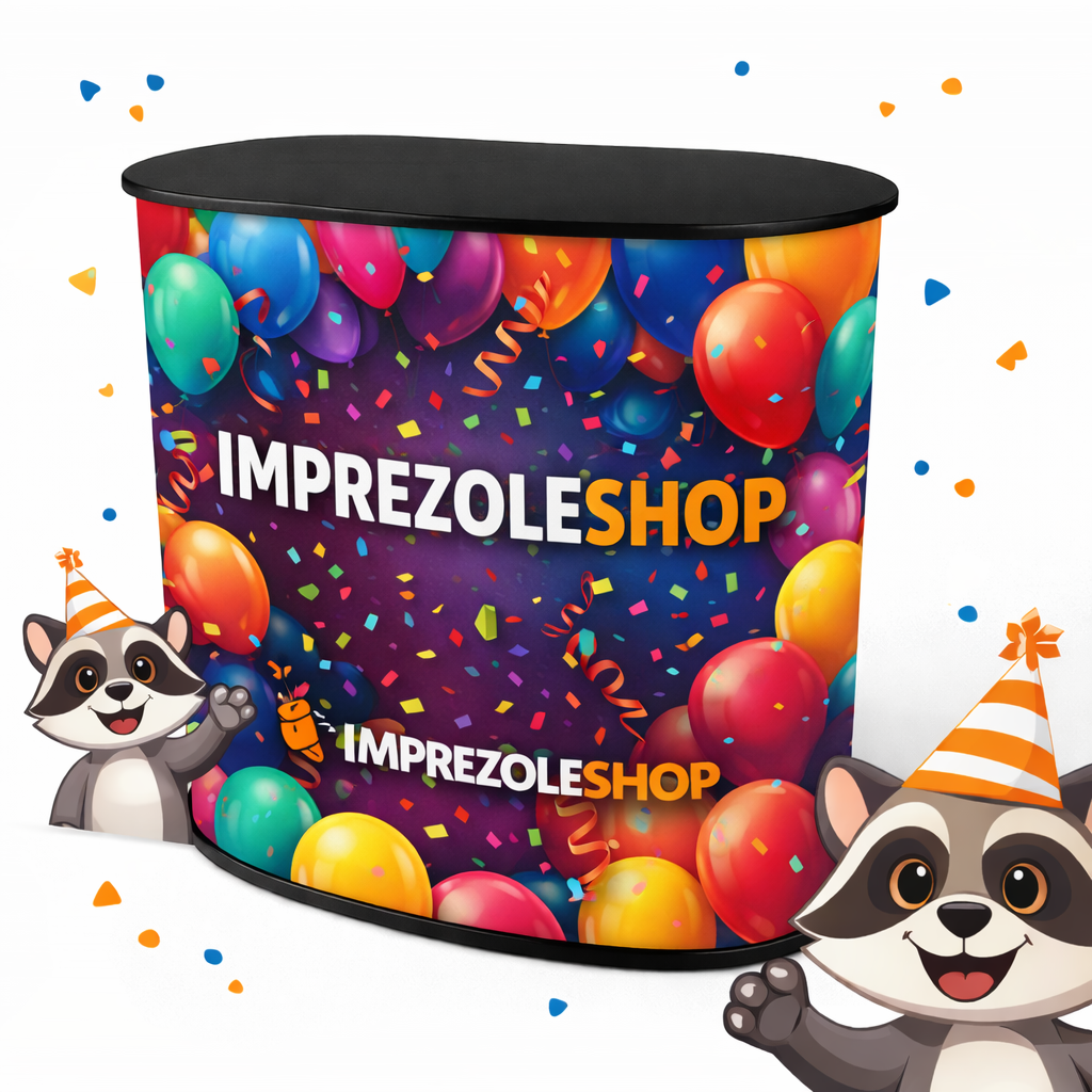 Duża trybunka reklamowa z półką idealna na targi, eventy, degustacje oraz akcje promocyjne. Stabilna konstrukcja i duża powierzchnia reklamowa skutecznie przyciągają uwagę klientów, a praktyczna półka pozwala przechowywać ulotki lub produkty.